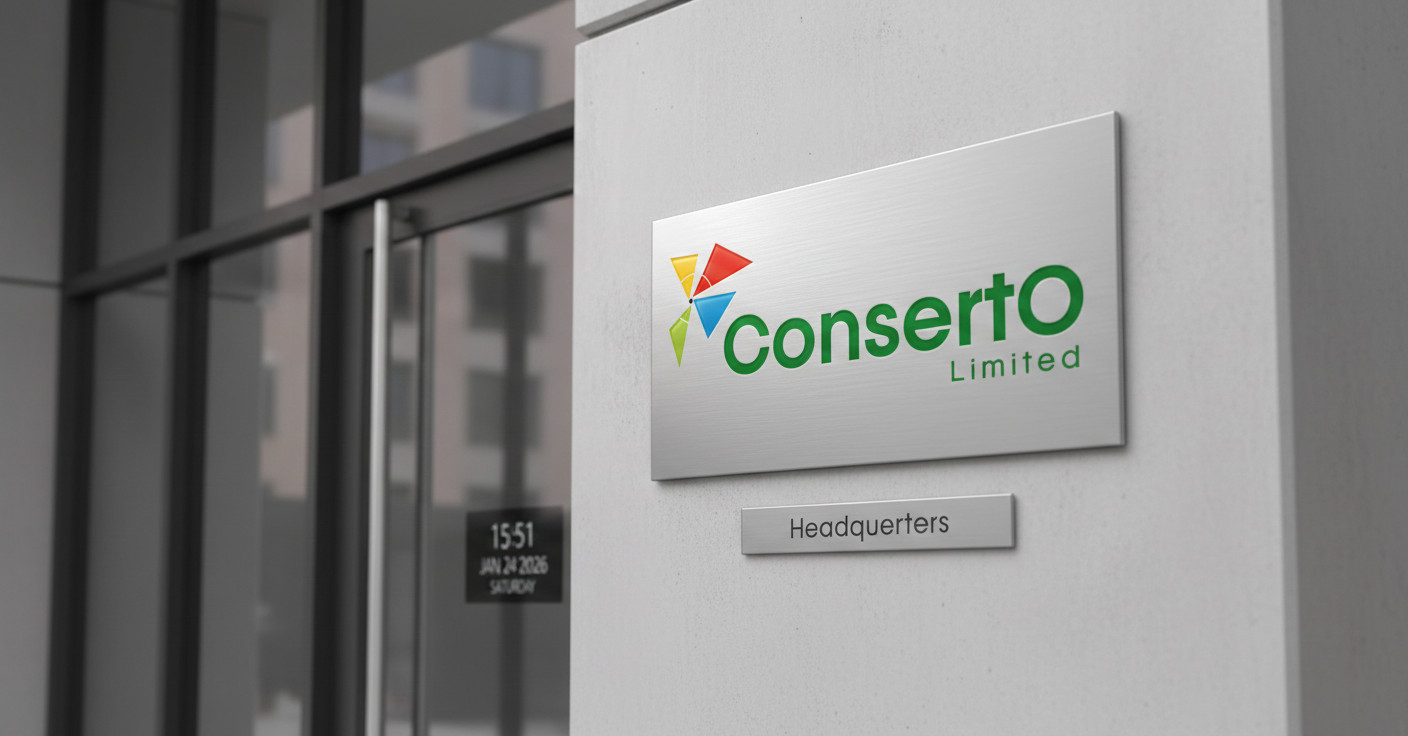 A bold, geometric “C” symbol inside a circle represents global reach, momentum, and impact.